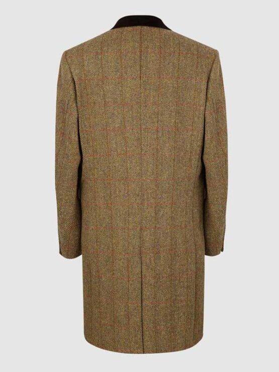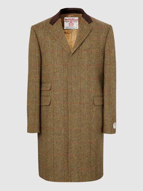Sleek and expertly tailored our Chelsea coat is a classic overcoat fit. Slip it over your city suit or on top of winter country layers. The Harris Tweed cloth is complimented by a soft velvet top collar for that little bit of extra comfort and luxury. Mustard check Harris Tweed Hand woven from 100% pure wool Brown cotton velvet collar Centre vent 3 button fastening covered placket fastening Paisley lining