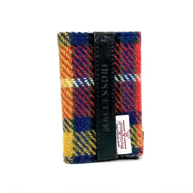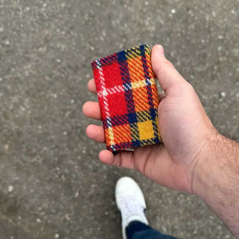 Onze Harris Tweed pop-up kaarthouder spreidt uw pasjes uit met één druk op de knop en beschermt ze tegen RFID-skimming dankzij de aluminium behuizing.