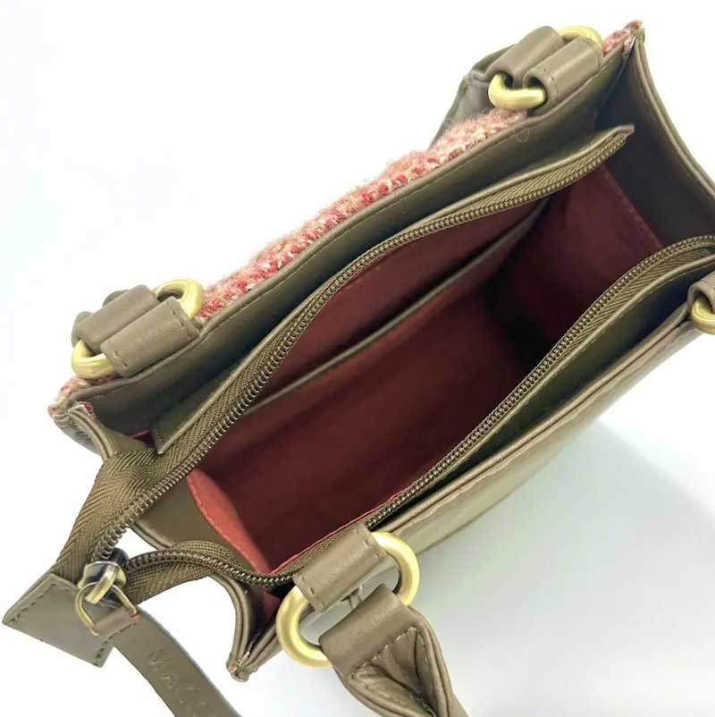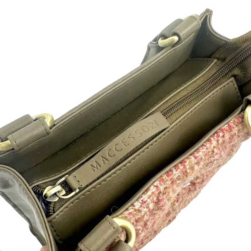De Harris Tweed tas heeft een ritsvak aan de achterkant, een open vak en een ritsvak aan de binnenkant.