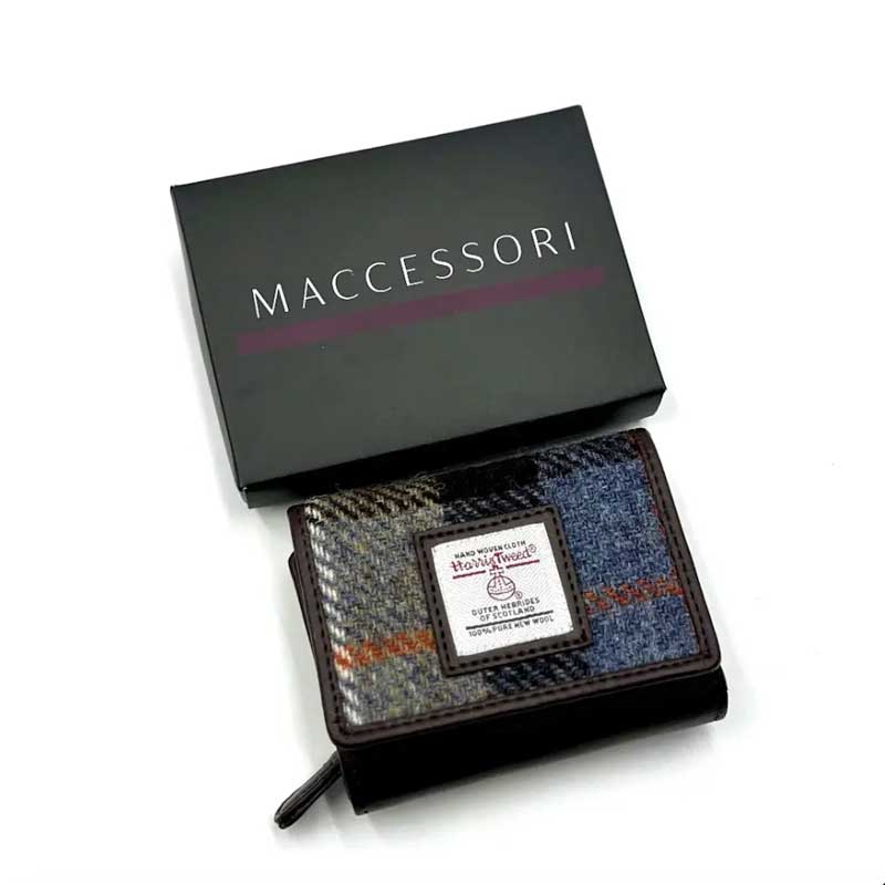 Harris Tweed Trifold Purse In Blue/Brown Check.