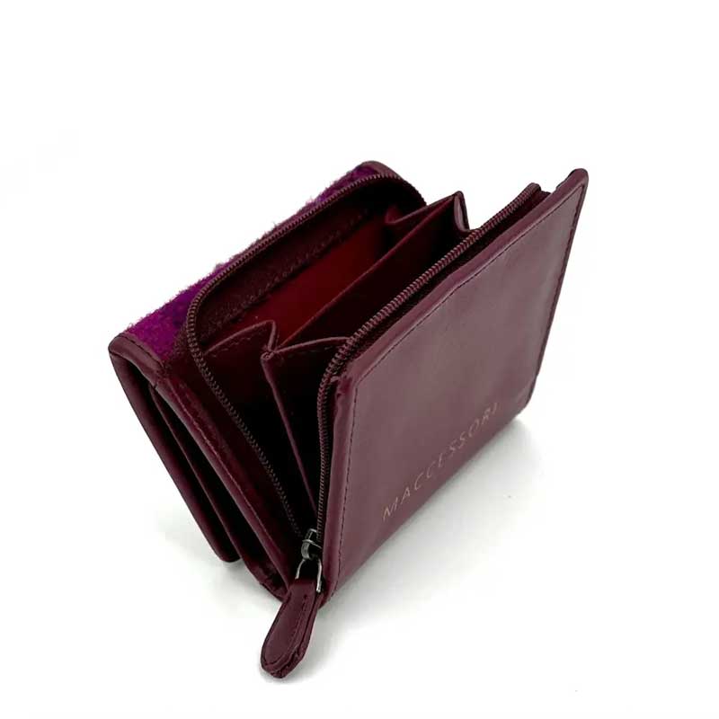 Onze trifold purse is verkrijgbaar in negen Harris Tweed-kleuren. De afwerking van het veganistisch leer verschilt afhankelijk van de gekozen Harris Tweed-kleur:– Turquoise Herringbone – Grijs veganistisch leer – Purple Check – Ossenbloed veganistisch leer – Green/Purple Check – Paars veganistisch leer – Blue/Brown Check, Country Green – Bruin veganistisch leer – Maple – Olijfkleurig veganistisch leer – Pastel Pink – Berry Jam veganistisch leer – Blue/Pink Check – Zwart veganistisch leer