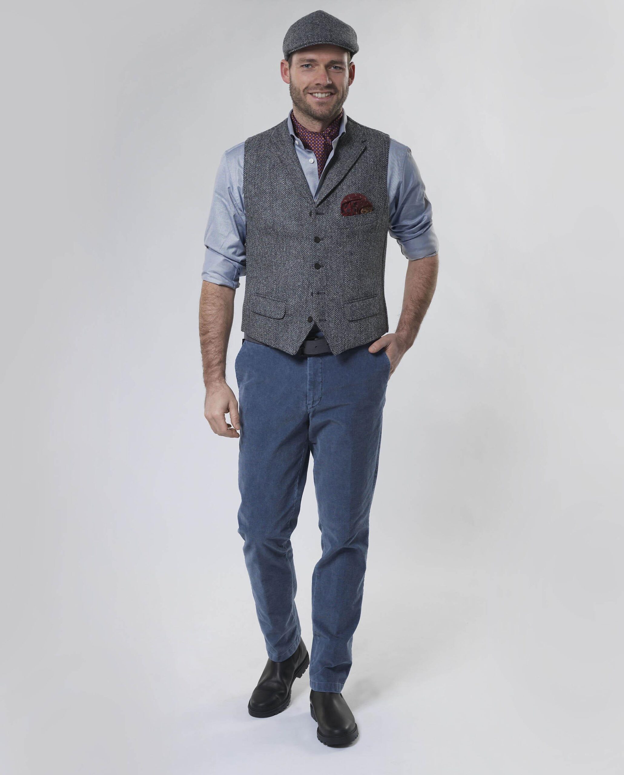 A classic 5 button waistcoat, with the added appeal of a collar, that can be worn with or without a jacket. Created to compliment our jacket styles, the Angus Waistcoats are available in a variety of Harris Tweeds and are finished with an attractive paisley lining back. Harris Tweed Angus Waistcoat n Brown Herringbone Check Tweed sourced from Scottish Mills Woven from 100% pure wool Paisley lining back Back belt and buckle Jetted pockets with flaps Modern Tailoring